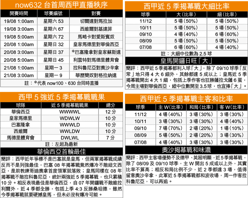 同日早場方面,切爾達07年降班後,再度重返西甲,無疑球隊基本陣容不強,仍然以升班功臣為主力,但起碼鬥志十足;作客的馬拉加因中東財團撤資下,一下子已出售辛迪卡索拉、荷西朗頓等主力,加上多次傳出欠薪消息,莊家開出切爾達讓平/半,已反映對主隊信心,一於捧上盤(球賽編號:星期六53;now632台明日1:00am直播)。尾場馬略卡主場對愛斯賓奴,兩支中型班實力接近,首戰料難分高低,博愛奴不敗[+1]「客勝」(球賽編號:星期六72;now632台明日5:00am直播)。