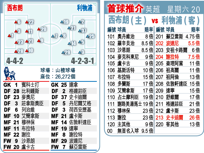 加上西布朗上季主場成績差,19戰得6勝3和10負,可見未必可藉主場踢高一班,因此信紅軍作客贏波。