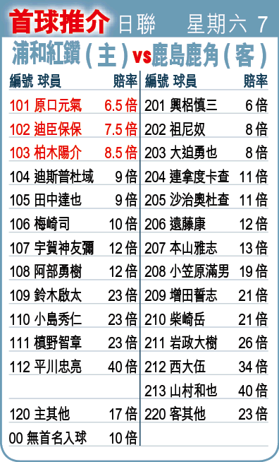 浦和紅鑽要搶分爭標,周六在日聯迎戰於客場表現差的鹿島鹿角,定傾力爭勝,故「讓球」開平手值捧。(球賽編號:星期六7;now631台今日6:00pm直播)