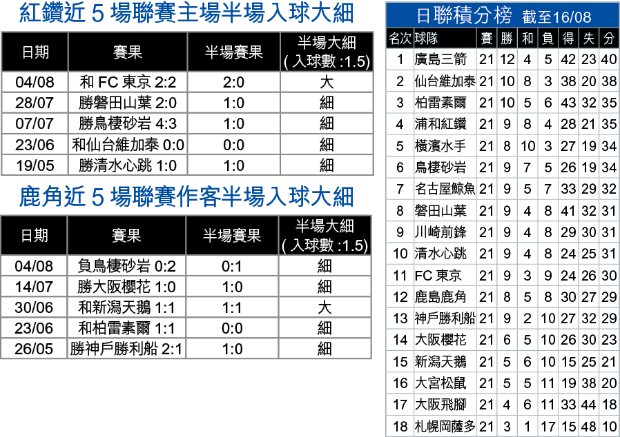 簡評:雖說浦和紅鑽進攻不是靠一人撐起,但今仗有首席射手馬斯奧李察迪斯停賽,畢竟會帶來影響;鹿島鹿角今季日聯11場作客只得7個入球,是其中一支作客入球最少的球隊。大部分比賽的半場都少開入球「大」,而紅鑽近5場主場及鹿角近5場作客都又只得一次試過開入球「大」,如果想穩陣,半場細盤必捧。