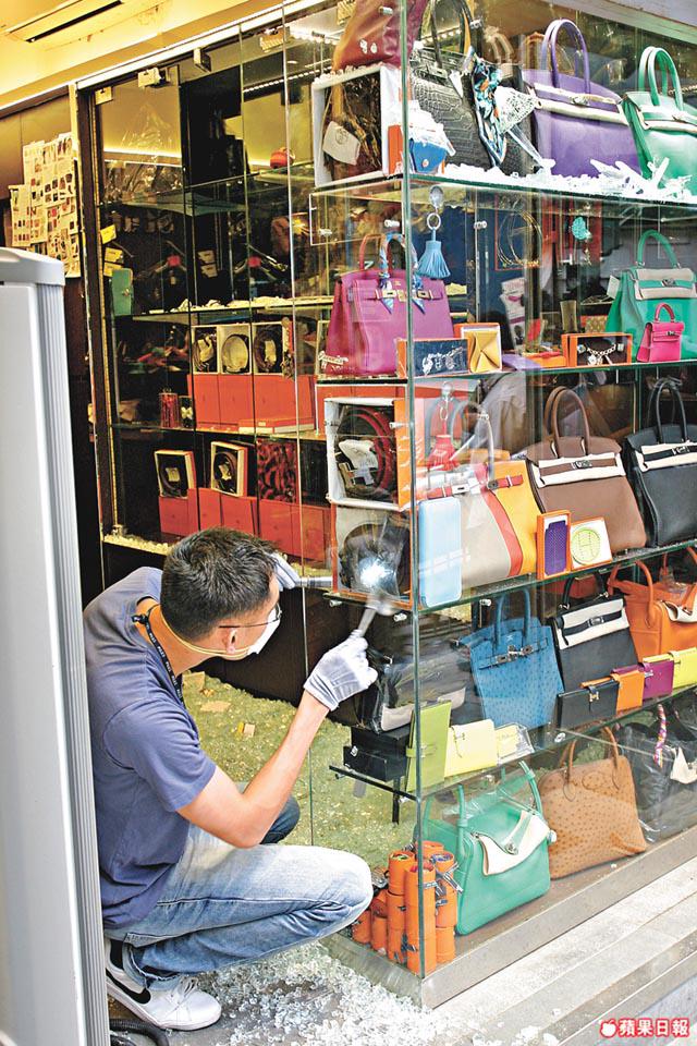 賊人在砸碎飾櫃玻璃時已觸動警鐘,但警員接報到場時只見現場一片凌亂,滿地玻璃碎;警方事後通知姓武的女負責人返店點算失物,證實失去40個名牌手袋等總值487萬元。據稱,店內裝有六個閉路電視鏡頭,警方稍後取走錄影帶追緝賊蹤。
