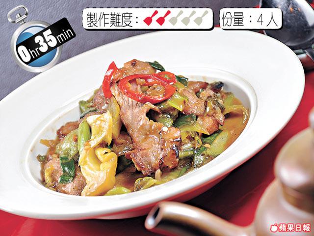 1.豬脢頭肉切片,加醃料拌勻略醃,然後以大火煎熟備用。