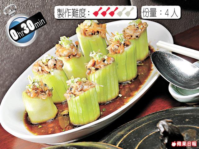 2.水瓜刨皮後切成約2吋段,直放在碟上排好,於每件水瓜面鋪上瑤柱絲及蜆肉。