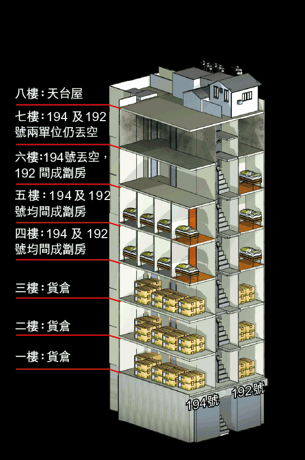 在花園街大火慘劇3幢唐樓,其中花園街192至194號唐樓在火警中最多人死傷,當中不少為劏房住客,但業主在收回燒至面目全非的劏房單位重新裝修後,竟然將劏房單位重新複製,《蘋果》記者連日直擊發現,劏房不單止被還原,而且越劏越多,198號唐樓更出現「一劏九、租上租」的情況,有住客知道有安全隱憂,但無奈道:「呢度租金較同區嘅平,睇錢份上租住先。」