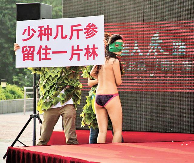 裸體護林!北京朝陽公園於周日(19日)下午舉行「重走人參路」的推廣活動。一名女子在活動尾聲時,竟脫光上衣,與幾名身穿樹葉裝的同伴舉起「少種幾斤參,保護一片林」的標語(圖),抗議毀林種參。