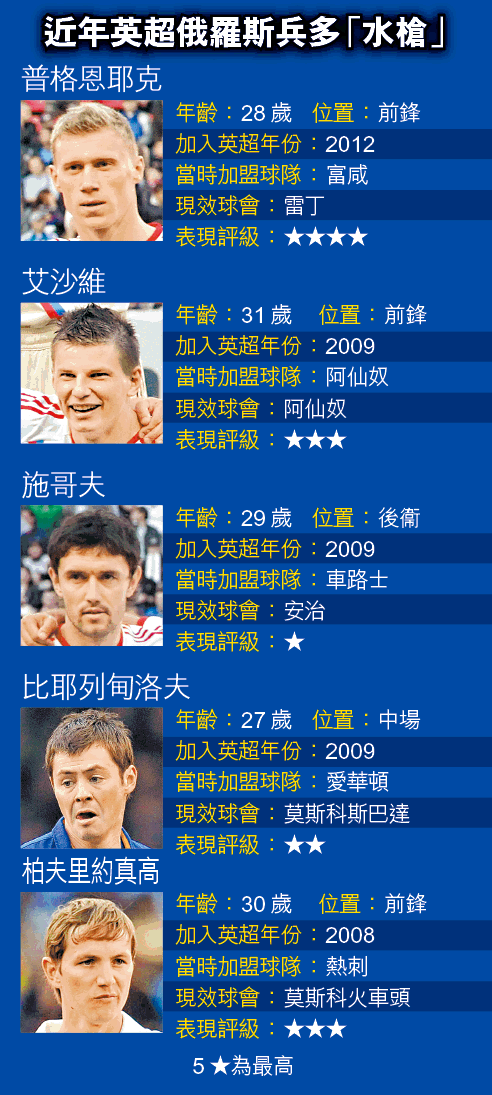 90年代於英超球員效力的俄羅斯球員寥寥可數,包括翼鋒簡察斯基以及門將卡連。直到俄羅斯國家隊於08年歐國盃勇闖4強,才在英超冒起俄兵熱潮。艾沙維在09年加盟阿仙奴,一度成為兵工廠的絕對主力;然而隨着近一年狀態下滑,上季被外借往母會辛尼特,新球季季前一直找不到合適買家下,最終無奈留在兵工廠。其餘俄兵如柏夫里約真高、施哥夫以至比耶列甸洛夫,都無法在這裏踢出名堂。