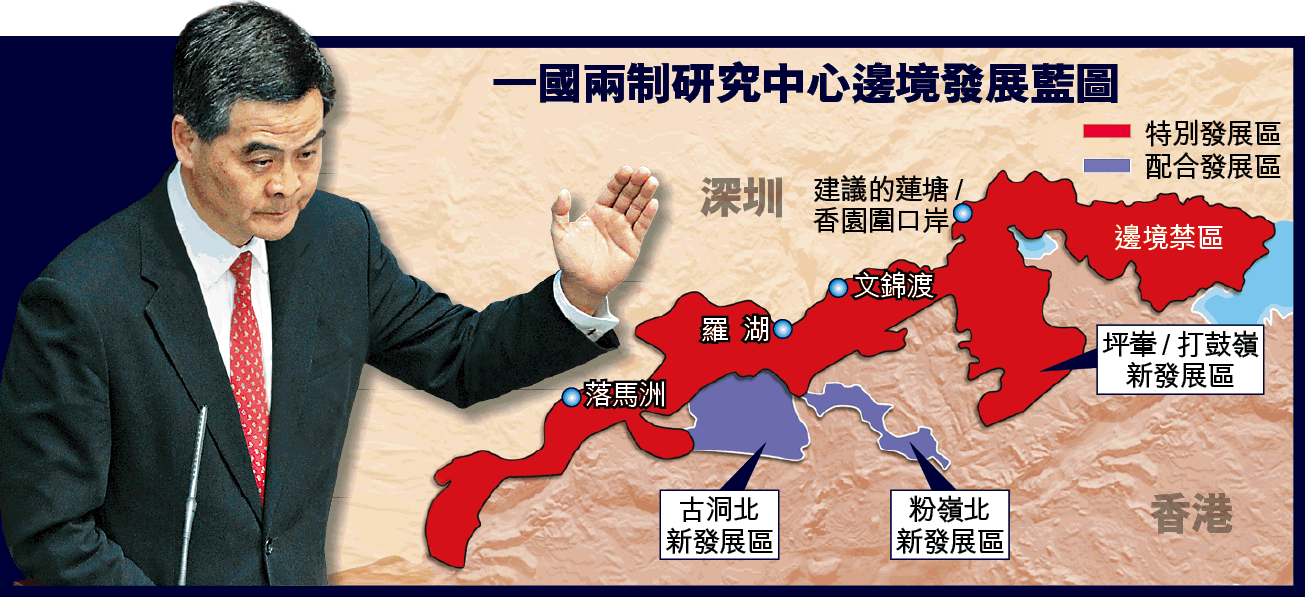 【本報訊】上任未夠兩個月的特首梁振英,已急不及待策動中港一體化大計。梁的智囊組織一國兩制研究中心透過左派報章「放風」,透露政府計劃在邊境開放禁區上,設立容許內地人免簽證入境的「邊境特區」,並將新界東北三個新發展區併入邊境特區或變成「附庸區」,為邊境特區提供商業、居住和消閒等配套功能,整個區域面積達3億4,300萬平方呎, 相等於半個香港島。民間團體炮轟梁振英將香港土地「割讓」給大陸,破壞一國兩制,出賣港人。