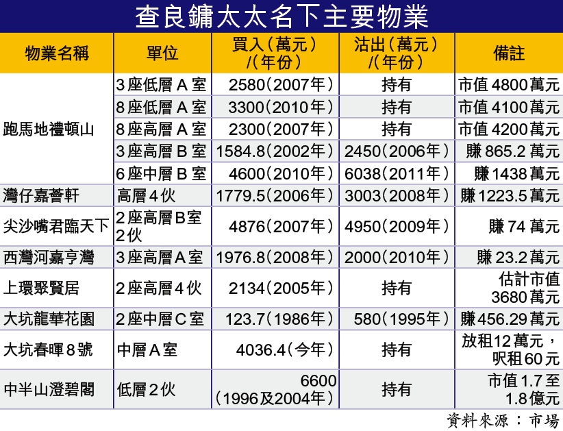 其後,她購置的豪宅主要是一手貨或新晉豪宅。如恒地(012)05年開售的上環聚賢居,她以個人名義斥資2134萬元購入四伙,07年收樓後一直持有至今。按土地註冊處資料,該四伙未見承造按揭,有指部份在市場出租,隨着近年樓價急升,該批單位已升值逾70%,迄今估計市值已升至約3680萬元,升價達1546萬元。