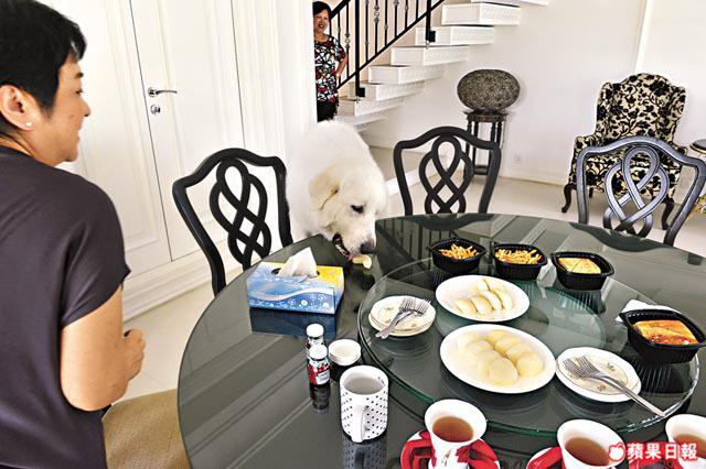 訪問期間,饅頭可能嗅到廚房飄來香氣,不停在門口徘徊,看到餐桌放了水果茶點,饅頭索性把頭擱在桌邊,眼甘甘望着美食,千千請牠吃過梨子後,為食的饅頭乖巧跟隨主人,人狗在客廳追跑不停。