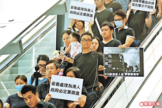 殉職領隊謝廷駿的兄長謝志堅和弟弟謝志恒,連同倖存者易小玲、陳國柱和李瀅銓,以及一班旅遊業從業員和熱心市民,一行約30人,昨由金鐘港鐵站遊行至添馬艦政府總部,沿途呼叫口號,要求政府妥善跟進人質事件。