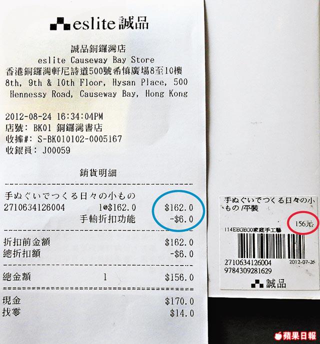 本報記者昨到誠品選購原價售1,200日圓、標價港幣156元的日本手工藝書。付款時,收銀員用掃描器掃過書背上的電腦條碼,並說「盛惠162蚊」,職員未有向記者說明該書加了價。記者付錢後,再問職員為何收費較標價高6元,經多番追問,店員才解釋「收162蚊係電腦出錯」,最終願退回6元差價。
