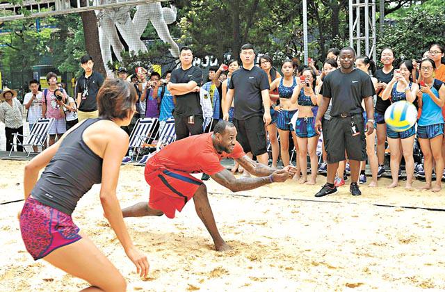 連日來走訪中國不同城市的占士,昨午與中國靚女沙排代表張希/薛晨「學藝」打沙排,心情大好,3人連同大帝的助手分成兩隊對賽。該名27歲球星在雙姝面前毫無架子,認真地向同齡拍檔張希學習開波;不過,今季連贏NBA總冠軍及奧運金牌的大帝,卻錯漏百出,不是打球落網,便是擊球出界,不時說sorry,場面搞笑,最終以2:5不敵薛晨與大帝助手的組合落敗。