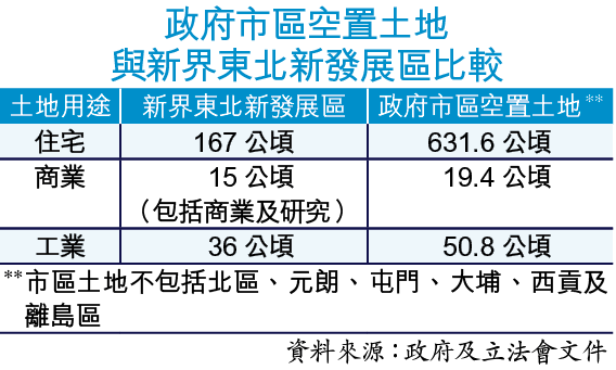 不過,政府向立法會提交的文件顯示,即使扣除新界及離島地區例如北區、元朗、屯門、西貢和大埔等,市區內仍有大量已規劃用途的空置政府土地。當中劃為住宅用途、仍在「曬太陽」的土地達630公頃以上,其中沙田和荃灣分別有295及81.5公頃住宅用地仍未發展,南區也有46.5公頃住宅地待用,比新界東北3個新發展區可提供的逾160公頃住宅地多出數倍。