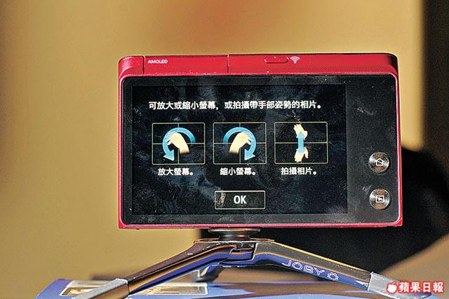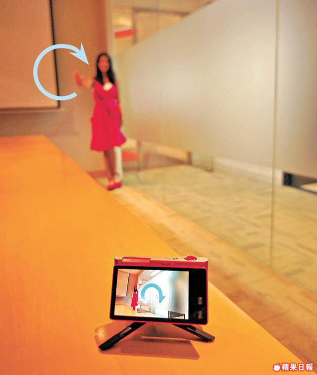 其實Samsung曾推出過一款將智能手機當成Remote嘅DC,可做出隔空變焦、拍攝等動作,但由於反應慢,加上Wi-Fi又經常斷線,未能成大器。今次MV900F表現好得多,順時針轉圈嗰陣,雖然鏡頭逐啲逐啲伸出嚟,但明顯動作順滑,而且反應超快;另外,相機喺拍攝前會畀三秒你擺好Pose準備,認真體貼!要留意係,當日我哋用盡15呎室內空間試玩,感應出乎意料地準確,太近佢反而未必感應到。