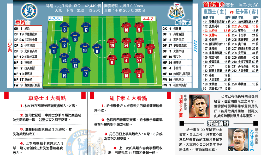 車路士季初氣勢如虹,今晚繼續在主場迎戰紐卡素可望再下一城。紐卡素今仗將重組鋒線黑雙煞,進攻上仍有一定威脅,博車仔在主場小勝,開[-1]「和局」。(球賽編號:星期六56;有線200及300台明日0:30am直播)
