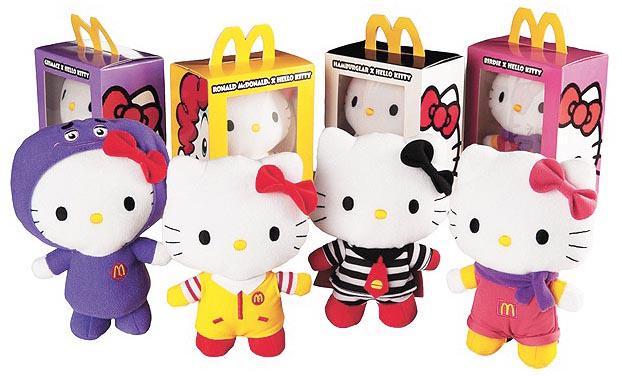 全台瘋搶HelloKitty。台灣的麥當勞昨開始換購最新HelloKitty系列中,最後一款「奶昔大哥」公仔(圖左),但混亂不斷,其中台中有分店一度只有18個公仔讓顧客購買,令民眾鼓譟,一度要警員到場調解。