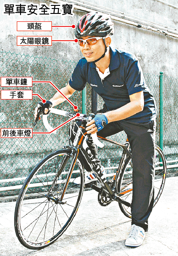冼指出,單車安全五寶包括頭盔、太陽眼鏡、手套、前後車燈及單車鐘,「單車頭盔分公路車及爬山車兩款,要根據所騎單車選購及親自試戴。」他說,單車太陽眼鏡可防風沙,免眼睛受突襲跌倒;根據法例,晚上騎單車必須安裝前後車燈,使其他道路使用者注意免相撞,「買齊五寶1,000蚊搞掂,就算發生意外,可以將傷勢減到最輕。」
