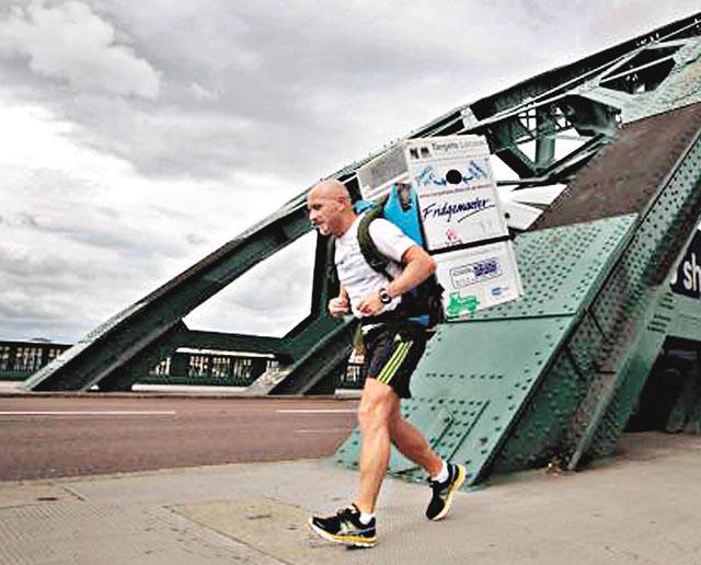 英國48歲男子莫里森為善最樂,但行善方式卻很特別──連續30日每朝上班前揹起一個小型雪櫃(圖),在三小時內跑畢21公里半馬拉松。這名市場推廣公司總裁在雪櫃開了一個洞口,讓沿路支持他的人入錢,為協助抗癌的慈善基金籌款,他目標是籌2萬英鎊(24.7萬港元)。他笑說輔幣較重,希望多捐紙幣。英國《每日郵報》