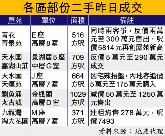 【本報訊】全城無懼「梁十招」繼續高價搶貨。青衣青泰苑516方呎居屋單位,更在「梁十招」後昨反價2萬元至300萬元癲價售出,呎價高達5814元,青泰苑樓價月內四度破頂。天水圍天頌苑凶宅辣招盤,內地客追價5萬元購入。記者:朱連峰