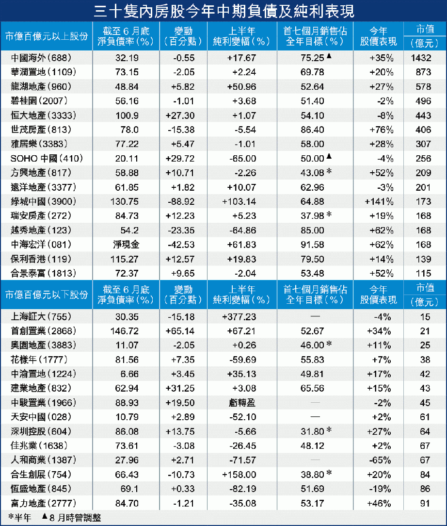 至於今年初定下800億元(人民幣.下同)銷售目標的中海外,早被分析員指過份審慎,結果不足八個月已達標,並在上月將目標上調至1000億元的紀錄新高,追貼一哥萬科。再者,目前內房板塊淨負債率普遍逾六成,中海外卻可維持在32%偏低水平,中期純利又漲18%,表現更勝部份受政策扶持的國企。