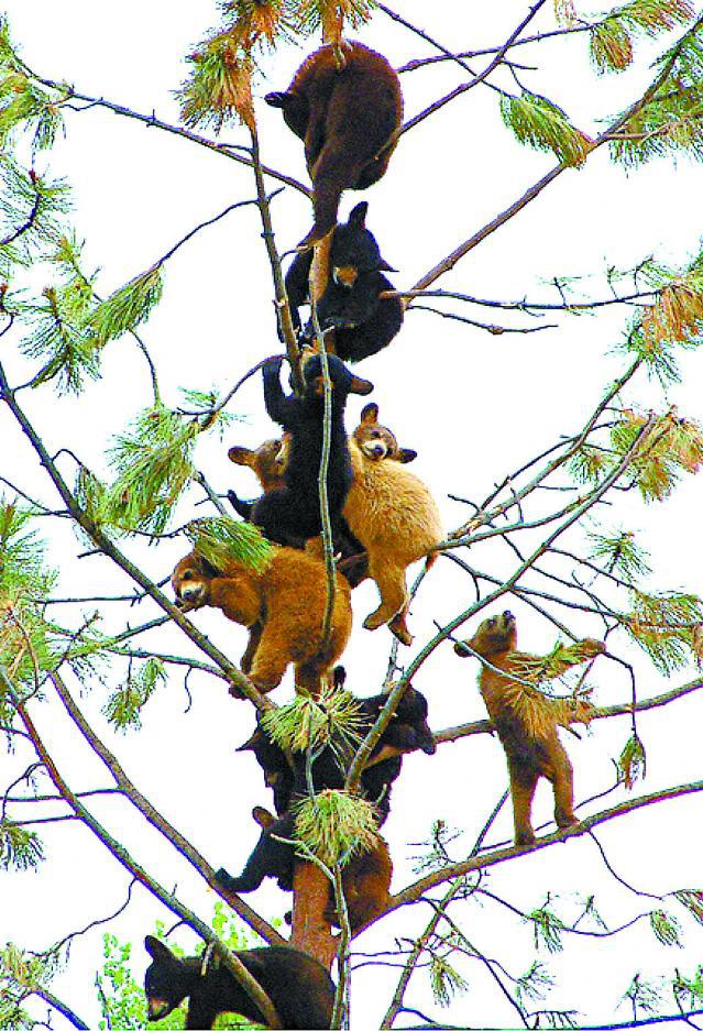 美國一個樹林出現罕見熱鬧,11隻頑皮小棕熊一時興起,爬上樹上嬉戲。越爬越高,爬得累了,就懶理危險,坐在樹枝上休息。雖然頗擠逼(圖),但牠們似乎樂在其中,大樹成了牠們的遊樂場。