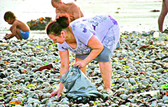 颱風捲起前所未見的巨浪,將大量蛤、珠蚌、蟹、海星(圖)和魚冲上拉茹爾恩納亞灣(Lazurnaya Bay),即使有人好心把海鮮擲回海中,巨浪又將牠們冲上岸,令沙灘變成蛤蚌「地毯」,大批市民惟有將海鮮放進膠袋或膠桶,滿載而歸地回家煮海鮮餐。英國《每日郵報》