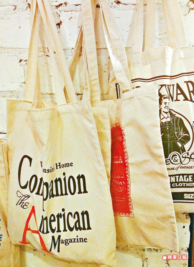 我大概一個月會去探訪佢一次,因為古着絕對是尋寶的學問,不能確定每個月有甚麼新品上場,因為一切講運氣。在店裏面大部份服裝都比較適合男生高大的身形,偶然會出現史露比角色的衞衣,假設合身,都應該見一件買一件,因為真是古董。為了符合女生的需要,也有Workware自家推出的衣服,主要是仿古Print的Tee,例如仿美國水兵的Logo Tee,寫着簡單字款NAVY和ARMY的Tee(的確有很多朋友喜歡這幾隻字的Print Tee),還有男生必備的Pocket Tee。Patrick本身是設計師,店裏也有不少Tote Bag是復古設計,圖案本身也非常有古舊味道,而且是用絲網印刷的,每個印出來感覺都不一樣,我拿上手比對一下,有些淺色有些深色,但就是這種缺憾,成就人手絲網印刷的美感。