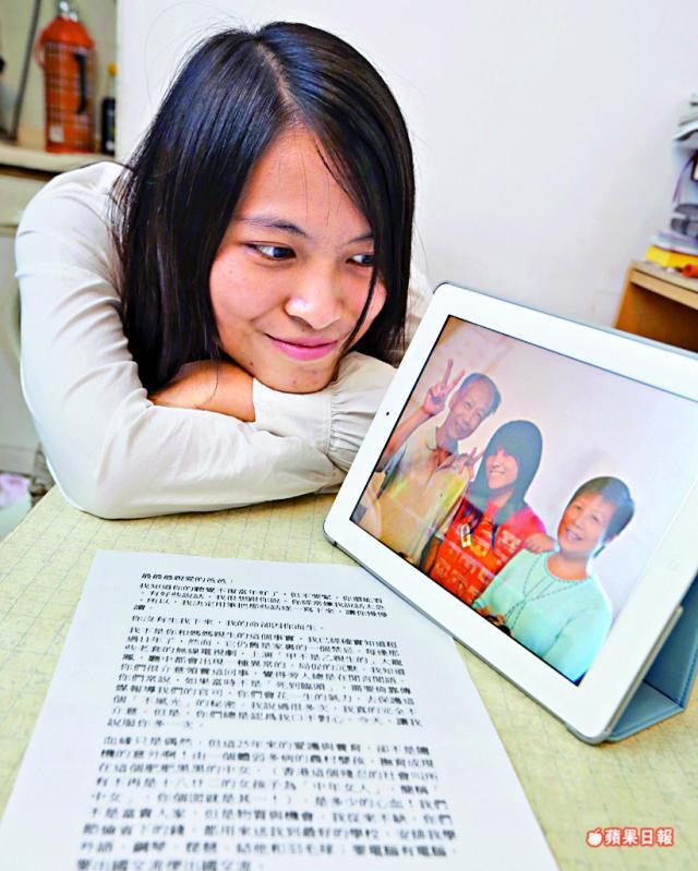 在客廳與小房間來回奔走,小妮子滿頭大汗,可惜擴音器聲音沙沙啞啞,與只剩兩、三成聽力的談爸爸,總是雞同鴨講。不過,望着屏幕上的女兒,年老的慈父,早已眉開眼笑,「現在的科技真的厲害,女兒越大越叻,我好安慰。」中過兩次風、接受過膀胱石和前列腺移除手術,又患有青光眼和白內障的談爸爸,笑着說。