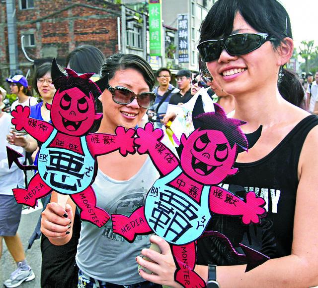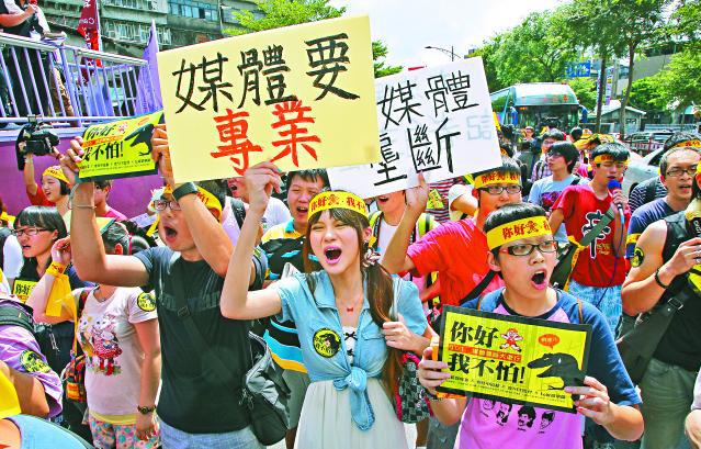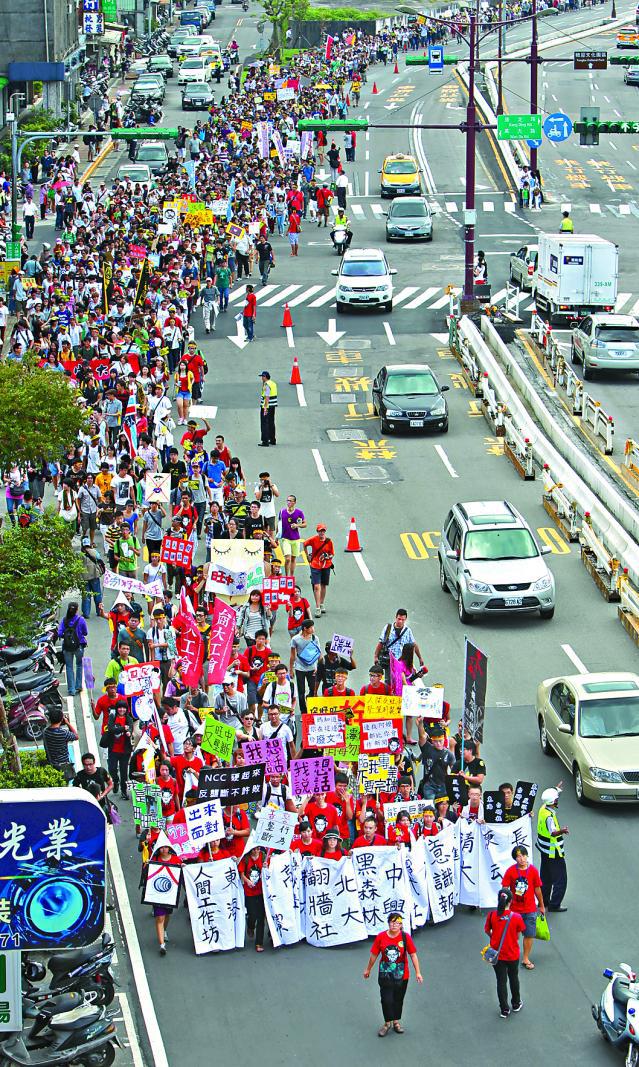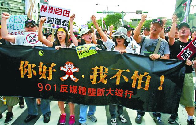 逾2,000人昨午在台北市萬華區的時報大樓集合,除台灣新聞記者協會、台灣媒體觀察教育基金會、媒體改造學社等團體派員參加,不少記者、多間大學的新聞系學生及民眾陸續加入,反對「媒體巨獸」,高峯期有逾萬人,遊行隊伍逾一公里長。