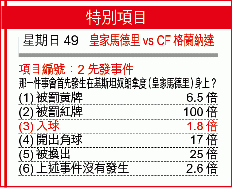 星期日9 華歷簡奴(平)x星期日25 華拉度列勝[+1](1.78)x星期日39 愛斯賓奴(下)x星期日49 皇家馬德里勝[-2](1.76)4x5