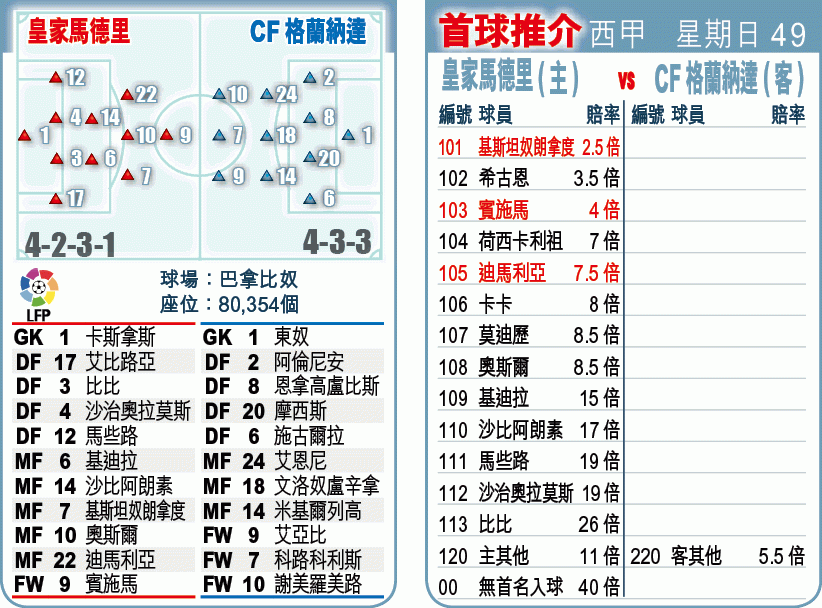 皇家馬德里剛於西超盃勇挫巴塞封王,更重要是拿下今季首捷。打破困局後好事自然來,今晚西甲聯賽主場迎戰CF格蘭納達勢大炒對手,讓得起兩球捧「讓球主客和」[-2]「主勝」。(球賽編號:星期日49;now635台明日1:50am直播)皇馬在新球季首兩場西甲意外地僅得1分。球隊於上周三西超盃次回合賽事以2:1擊敗巴塞,入球功臣基斯坦奴朗拿度表現出色,正如他自己所言會在開季10天後重拾最佳狀態。另一射手希古恩亦正值大勇,上仗建功後開季4戰已攻入3球。另一射手賓施馬則尚未開齋,一旦今仗獲派上陣,肯定表現落力。皇馬在轉會市場關閉前動作不大,只是由車路士借用主帥摩連奴舊部艾辛,不過後者難以馬上進佔正選位置;上周聯賽因辱罵球證被逐的法比奧干查奧,將停賽缺陣。CF格蘭納達開季兩戰同樣僅得1分兼只得一球進賬,進攻火力疲弱;新加盟的意大利前鋒科路科利斯表現平平,今仗對皇馬防線威脅有限,難逃大敗。