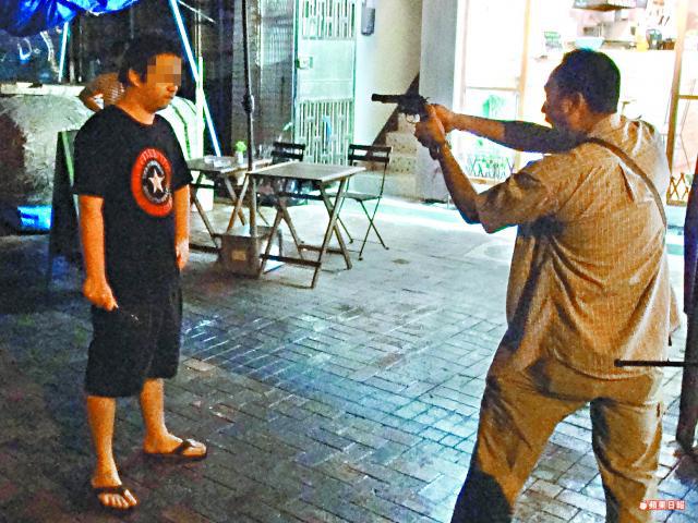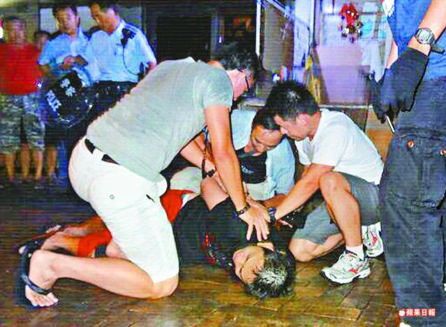 【本報訊】一名持刀狂漢,昨晚在長洲街頭亂走並沿途踢門,大批手持盾牌警員到場將他包圍,其間警員喝令他放下利刀時,狂漢一度揮刀企圖襲擊警員,警員多番擎槍相向,事後合眾警之力將他按在地上制服,事件中兩名警員受輕傷。