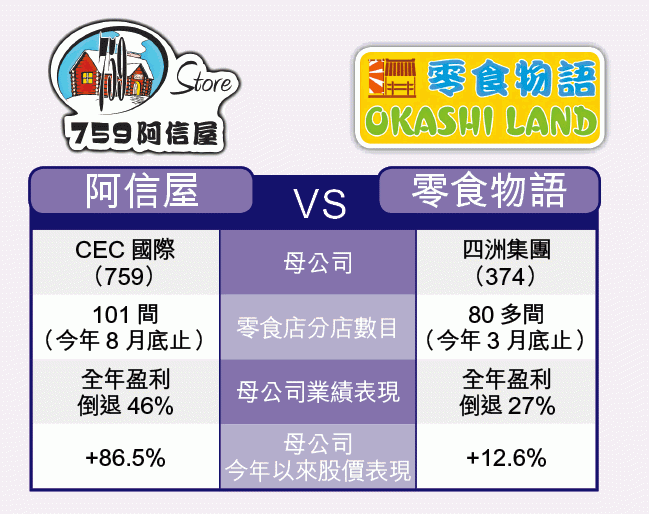 另一邊廂的四洲,為本港最大的日本進口零食代理,旗下亦設零售業務「零食物語」,據公司年報披露,至今年3月底止,零食物語分店數目80多間,已被阿信屋反超前,據公司網頁顯示,零食物語分店集中港鐵站及大地產商旗下商場,與阿信屋主打領匯(823)策略不同(見另文《成本篇》)。