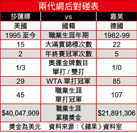 美國女球手「細威」莎蓮娜,星期日喺美網女單決賽同白俄羅斯「1姐」艾莎倫嘉打足3盤,最後以6:2、2:6同7:5擊敗對方,繼溫網同倫奧後再下一城。雖然細威經已30歲,但係有15個大滿貫錦標嘅佢,仲想打破德國名宿嘉芙保持嘅22個大滿貫錦標紀錄!
