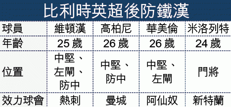高柏尼及華美倫在英超效力多年,已是聯賽中數一數二的鐵衞;前者是上季盟主曼城隊長,後者在尹佩斯離隊後亦接任阿仙奴隊長。高柏尼覺得比利時的足球水準正不斷提高,「太難盡錄了!我們有太多球員在英超搵食。希望在國家隊中,我們都可以發揮出在英超的水準。」除了這3名中堅,米洛列特司職門將,乃是新特蘭的後防磐石。文:咖喱