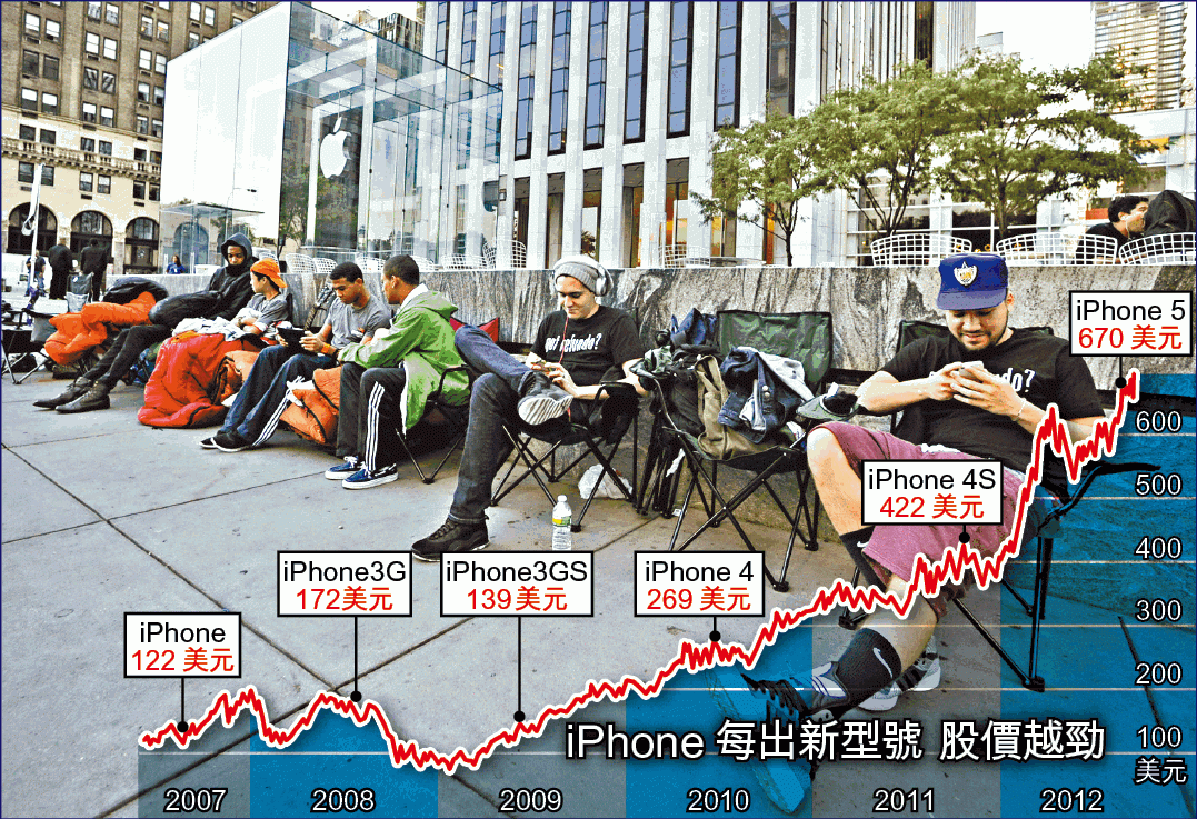 事實上,由2007年推出首部iPhone開始,蘋果的股價一直向上,其中於去年推出iPhone 4S時,股價單日更大升3.32%。分析指,蘋果股價升穿700美元,全賴新推的iPhone 5銷情理想,於首24小時定單已超過200萬部,為iPhone 4S推出時的兩倍,大大推高市場對蘋果的盈利預期。市場研究機構Asymco分析師Horace Dediu更預期,以iOS操作的蘋果「i字頭」產品總銷售將於2015年達10億部。