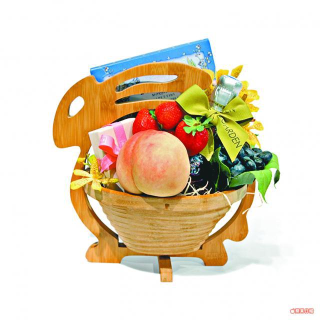 「玉兔迎月」 最吸引是竹製小兔造型禮籃,內有水果、意大利香脆曲奇、250毫升rose及LGB macarons。售480元。