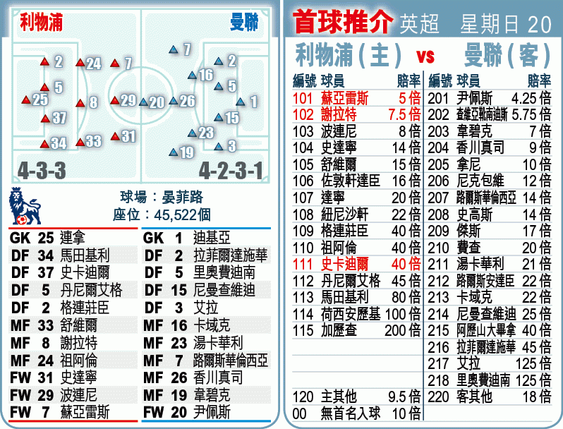 紅軍上周四以副選戰歐霸盃,於該仗休戰的謝拉特、蘇亞雷斯、格連莊臣、史卡迪爾及丹尼爾艾格等,料會重返正選鬥紅魔。然而,由史達寧、波連尼及蘇亞雷斯組成的3人鋒線未見太銳利,就算曼聯的後防在季初存有頗多漏洞,亦未必能取得甜頭。