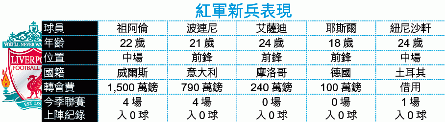 同樣失望是土耳其中場紐尼沙軒,在皇馬失去正選,退而求其次,以外借身份加盟利物浦,但一場失望的英超比賽,就差不多將他打落十八層地獄,對阿仙奴一戰打了67分鐘後,紐尼沙軒苦等18日才再有出場機會,但淪為二線兵出戰歐霸盃面對年青人;縱然5個入球都與紐尼沙軒無關,不過這位土耳其國腳仍滿意:「對我而言,這是一場不錯的比賽,我需要正式比賽提升狀態,這是我來到利物浦的原因。」中場沒有入球尚算說得過,前鋒交白卷卻罪大惡極,特別是被寄予厚望的意大利前鋒波連尼;波連尼在英超4戰都正選,但只累積7次射門,結果全部沒法換來入球。或者因為戰術需要,波連尼要出任右輔鋒,令這位慣常擔任正箭頭的意大利國腳進退失據。