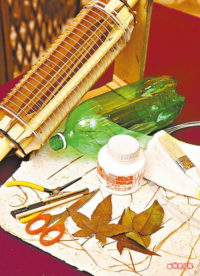 模具(如沒有可用膠樽代替)、鐵線、環保紙、白膠漿及掃子、濕毛巾、剪刀、刀、繩子、顏色筆、葉子等作裝飾用。