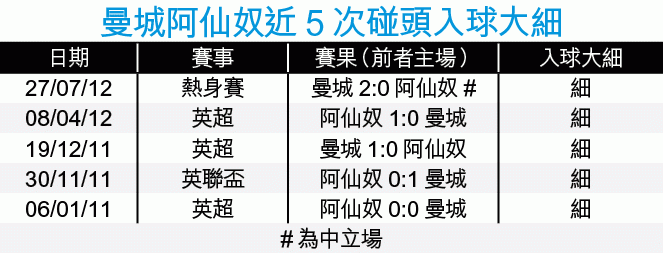 曼城迎戰阿仙奴,除了前者自08年至今近5次迎戰兵工廠取得4勝1負佳績外,兩隊對碰亦是入球「細」的保證。曼城與阿仙奴於最近3次在正式比賽對壘皆出現1:0賽果,若連今夏在北京鳥巢上演的熱身賽(上圖)亦計算在內,曼阿交鋒已連續5戰總入球數字不足3球,今仗入球「細」相當可取。