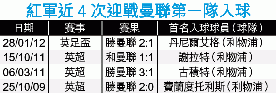 近年兩紅相遇利物浦的成績不太差,最近4次與紅魔交手僅一敗,而近5次主場作賽更取得4勝1和佳績。紅軍於過去4次迎戰曼聯皆能夠先開紀錄,「第一隊入球」捧利物浦穩陣。