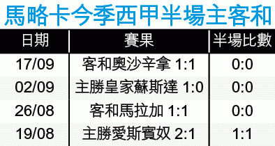 周日西甲早場馬略卡迎戰華倫西亞,主隊在今季成績有驚喜,至今仍保持不敗,取得2勝2和成績。球隊在該4場比賽皆在半場與對手踢成和局。今仗對手華倫西亞至今亦佔半數開出半場和局。