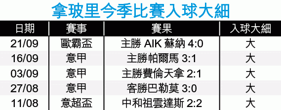 今晚意甲拿玻里客征卡坦尼亞,前者在意甲開鑼後連同歐霸盃4戰全勝之餘,每仗皆至少攻入對手兩球,4戰全開入球「大」。主隊卡坦尼亞則在至今3場聯賽每仗皆失兩球,今仗勢必大手交易。