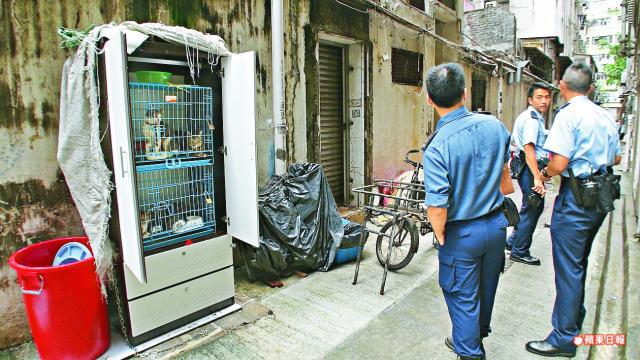 【本報訊】北角春秧街後巷一個神秘的大衣櫃,疑被貓殺手用作囚禁流浪貓的地獄,昨晨有清潔女工聽到貓兒喵喵哀鳴聲,通知貓義工報案,消防員破開綁着櫃門的鐵鏈,救出四隻貓兒,大部份屬流浪貓,事件懷疑是半年前西環貓殺手所為,警方正深入調查。
