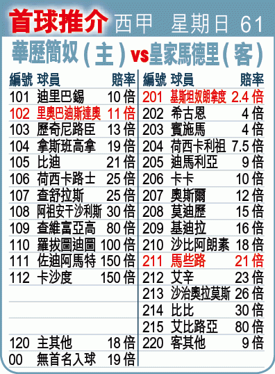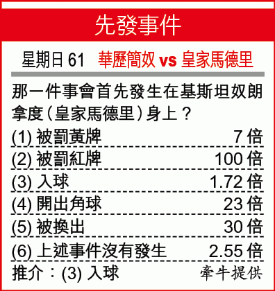 在歐聯險勝曼城稍為減壓的皇家馬德里,於周日聯賽再次作客,面對同市的華歷簡奴;以華軍今季主場未嘗一敗,皇馬剛於歐聯也耗力甚多,難以大勝,「讓球主客和」敲「和局」。(球賽編號:星期日61:now632台明日3:30am直播)文:牽牛