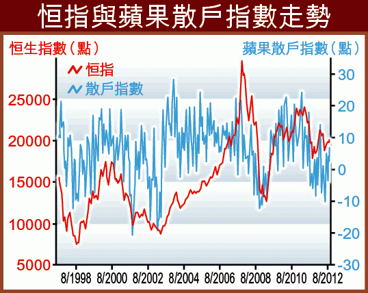 是蘋果財經忠實的讀者,一定聽過蘋果散戶指數,指數以電話錄音形式、隨機向年滿18歲以上的人、每周星期五收市後,查詢他們是否有投資股票、對後市樂觀程度、以及短期入市比例。