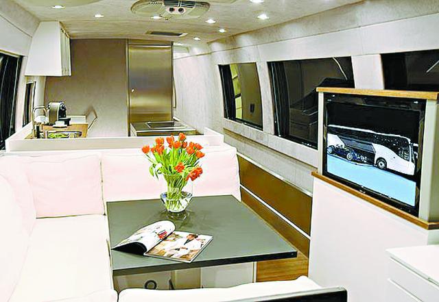 這輛12.2米(40呎)長的流動車,不但廚房、廁所、客廳一應俱全(圖),家具更非常講究,有超大雪櫃、洗碗機、豪華真皮梳化,更安裝了家庭環迴立體聲的音響系統和平面電視機。廠商更為客戶提供度身訂做服務,汽車外觀和內櫳尺寸悉隨尊便,但120萬鎊造價並不包括藏在行李架內價值17萬鎊(214萬港元)的法拉利跑車。