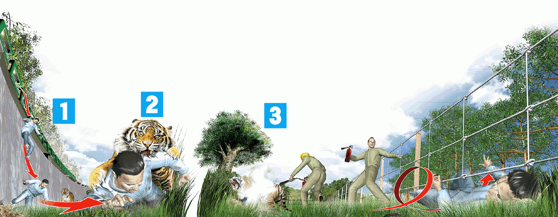 1)維拉洛博斯由架空觀光列車躍下,越過5米高的圍欄,掉落老虎園