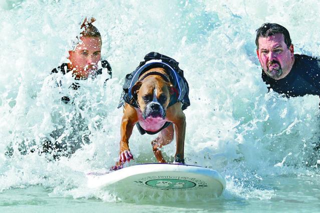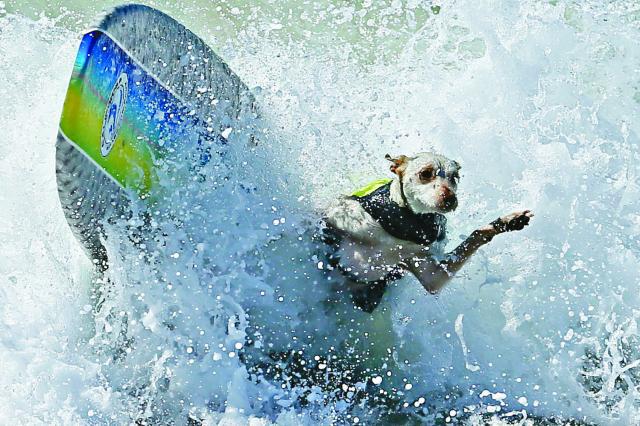 衝呀!滑浪水上活動,由人類世界傳至狗世界。美國加州亨廷登海灘,前日舉行年度狗狗滑浪大賽,參賽選手共48隻,在滑浪板上大顯身手,有的趴下,有的坐着,有的大膽站立,有的更表演180°或360°轉身高難度動作,逗得主人和觀眾嘻哈大笑。路透社